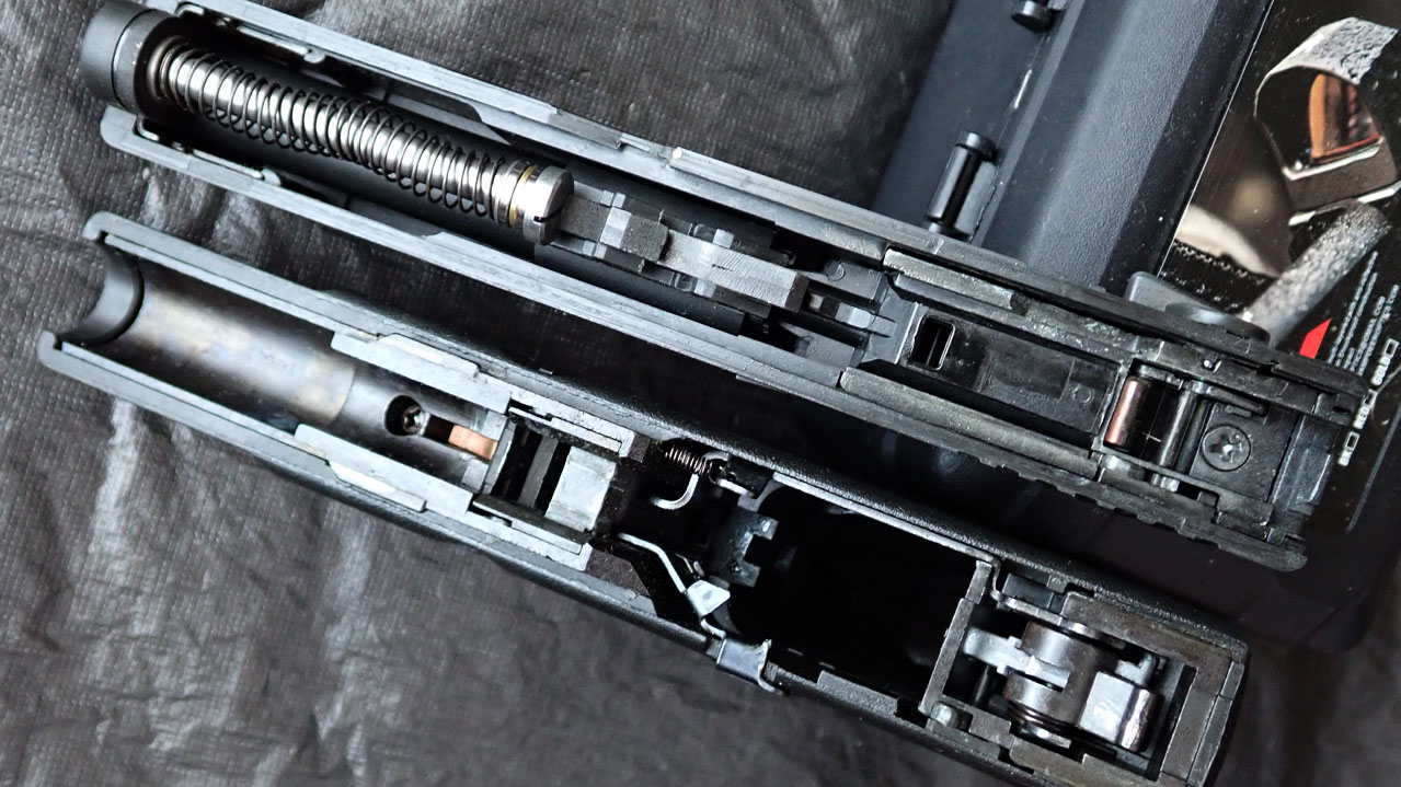 上はG23FというKSCオリジナル銃で、G18Cと同じ要領でフルオート切り替えが可能なG23のマシンピストルです。そしてスライドおよびフレームの中身。マルイとは異なっていることがわかりますね。G23F/G19ともにフレームがHWです。いまだに見るたび「なんでなん?」て言ってしまいます。なお、KSCのGlockバリエーションにはスレートフレームというフレームの後部下側のふくらみがないものがあって、すごく欲しかったんですが、見事に買いそびれています…。そのフレーム、1911/2011系に慣れた人ならありがたさがわかる代物かと。