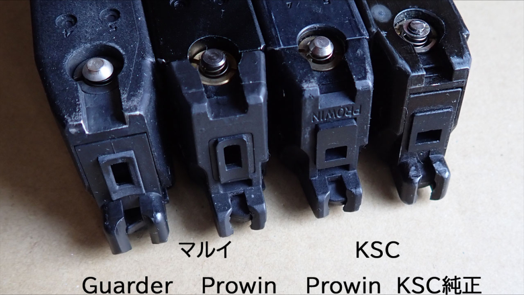 各マガジンのリップ部分を見てみると、リップの前後厚がマルイは分厚いのがわかります。これがKSCグロックにマルイマガジンを入れるとスライドが閉鎖しない理由です。またKSC純正マガジンは放出バルブ上部の溝というか切り欠きの幅が狭いのがわかります。これがマルイグロックにKSCマガジンが入らない理由です。Prowinはこの部分をうまく調整することで両社のグロックに入るようになっているわけです。