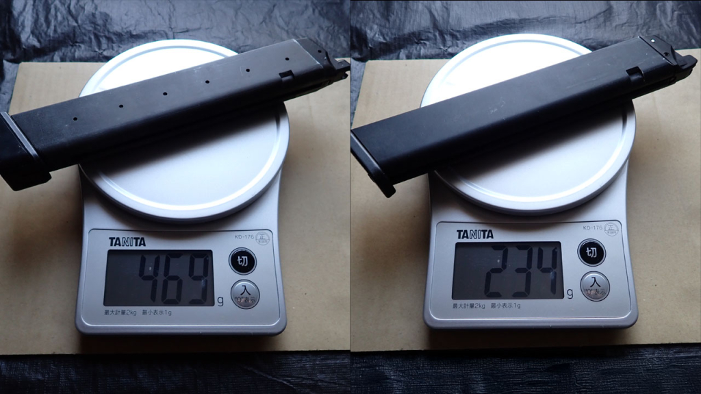 最後の写真は重量比較で、左がKSC純正ロングマガジン、右がProwinマガジンです。きっちり2倍の差があります…。KSCはM93Rでアルミ製ライトウェイトマガジンを販売していたこともあるので、メーカー純正の軽量マガジンをぜひ標準化してほしいですね。特にM4とかAR15とか5.56mmのSTANAGマガジンとか。