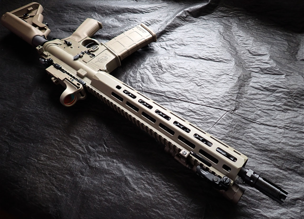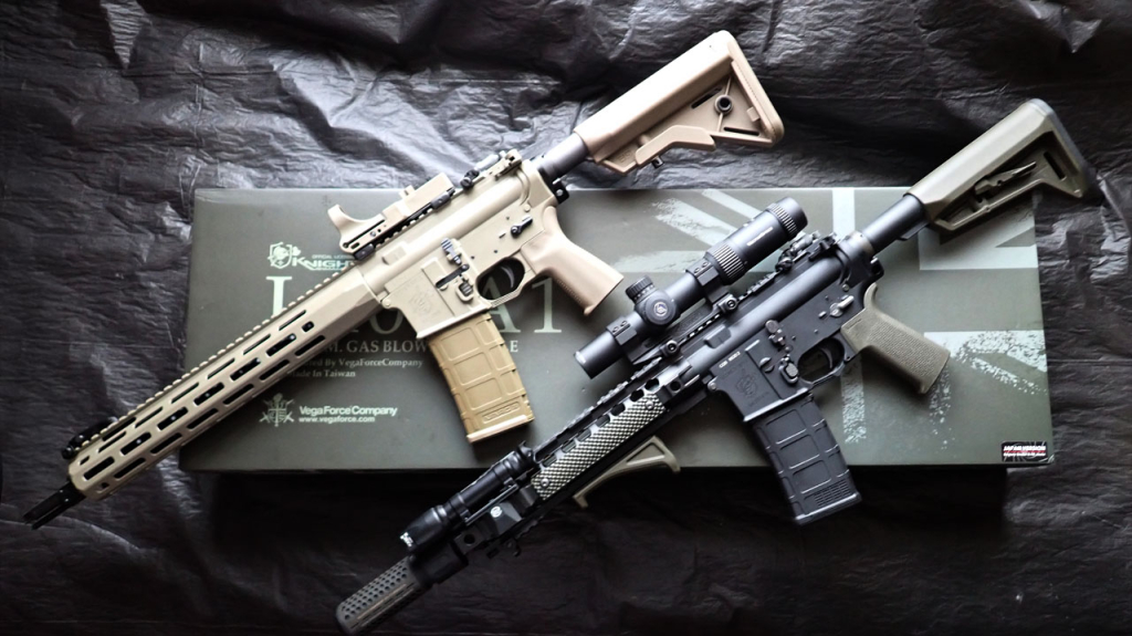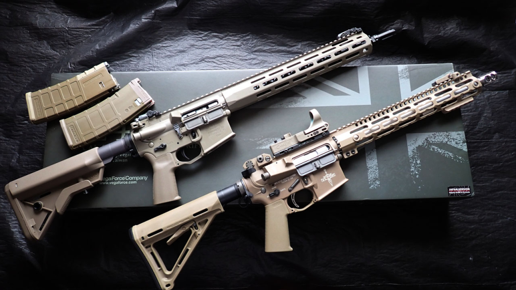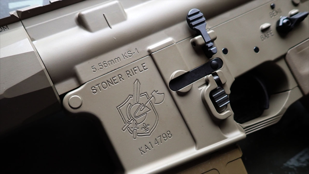 実銃に関して簡単に説明しますと、KACの軍および法執行機関向けの最新製品はKSシリーズで、13.7インチヘビーバレルのKS-1、14.5インチバレルのKS-2、11.5インチバレルのKS-3、民間転用を見越した16インチバレルのKS-4があります。このうちKS-1がイギリス軍の次期サービスライフルのL403A1として採用され、全体で1620挺の契約となっています。L403A1はKS-1単体ではなく、KACのサプレッサーとVortexの低倍率スコープ、AimpointのACRO、その2つのオプティクスを載せるマウント、SurefireのScoutLightのセットの呼称のようです。それでも単純計算で1挺あたり9300ポンド(約190万円)ほどといわれており、イギリスも財政難なので契約通りの納品数にはなりそうにない気がしますね。