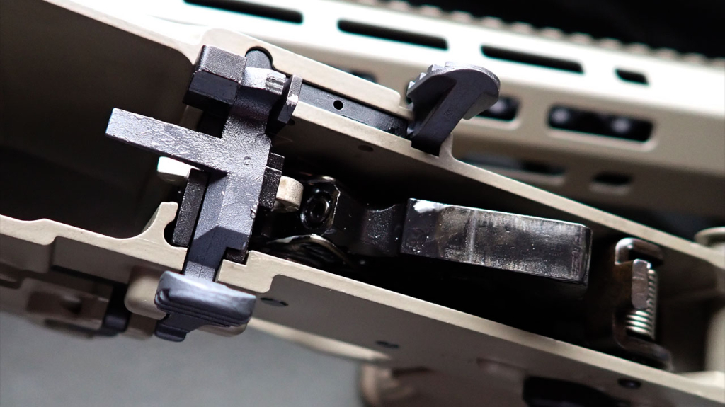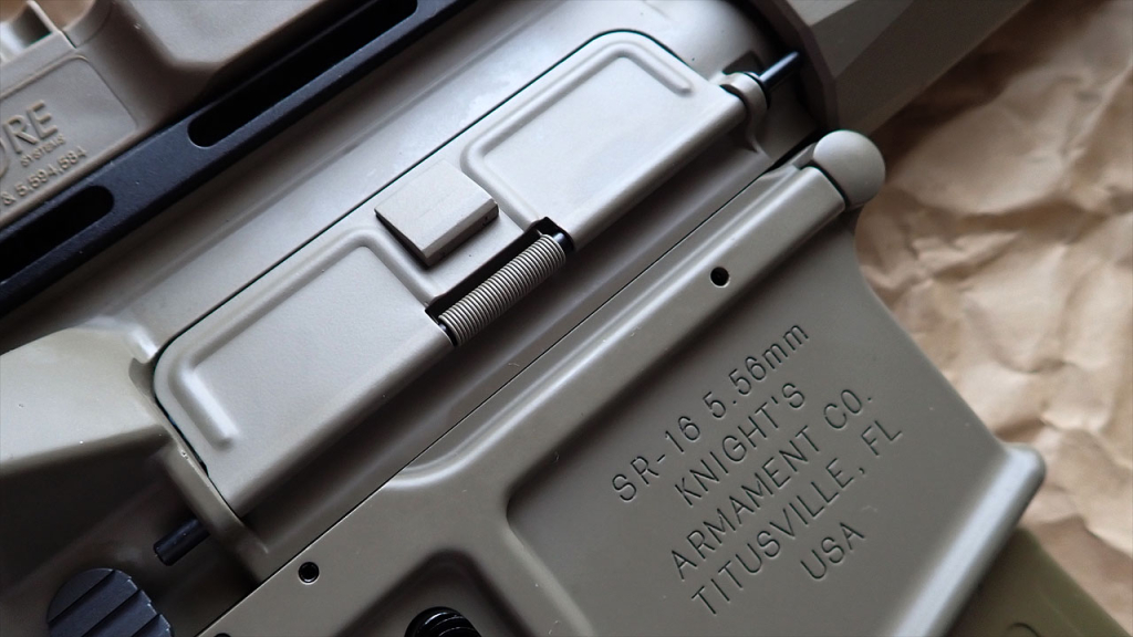 KACロゴ、そしてアンビなマグキャッチ。セレクタ含め操作系の小物は全てスチールです。ポートカバーは外側だけ塗装されています。内側が無塗装なのは実物もそうなのか、実銃のポートカバーの裏側が細かくわかる写真がネットで調べてもなかったのでわかりませんが、スプリングまで塗装されていて芸が細かい。レシーバー固定の前後のピンもFDEに塗装されてます。僕のように頻繁に分解する人には悪夢ですが。