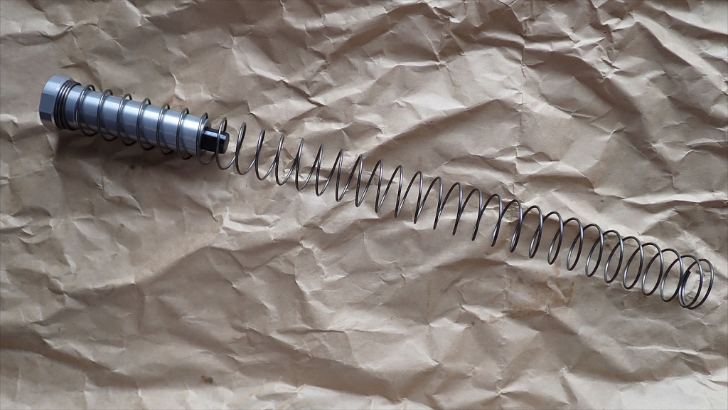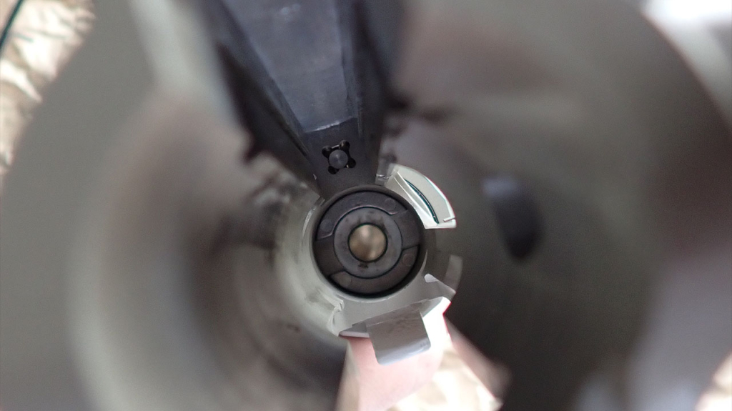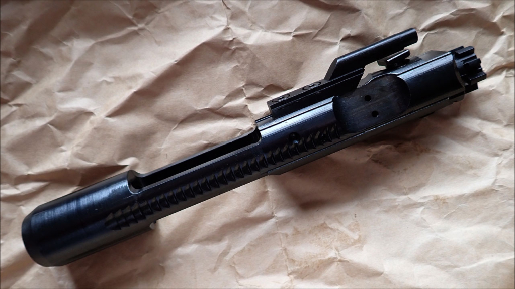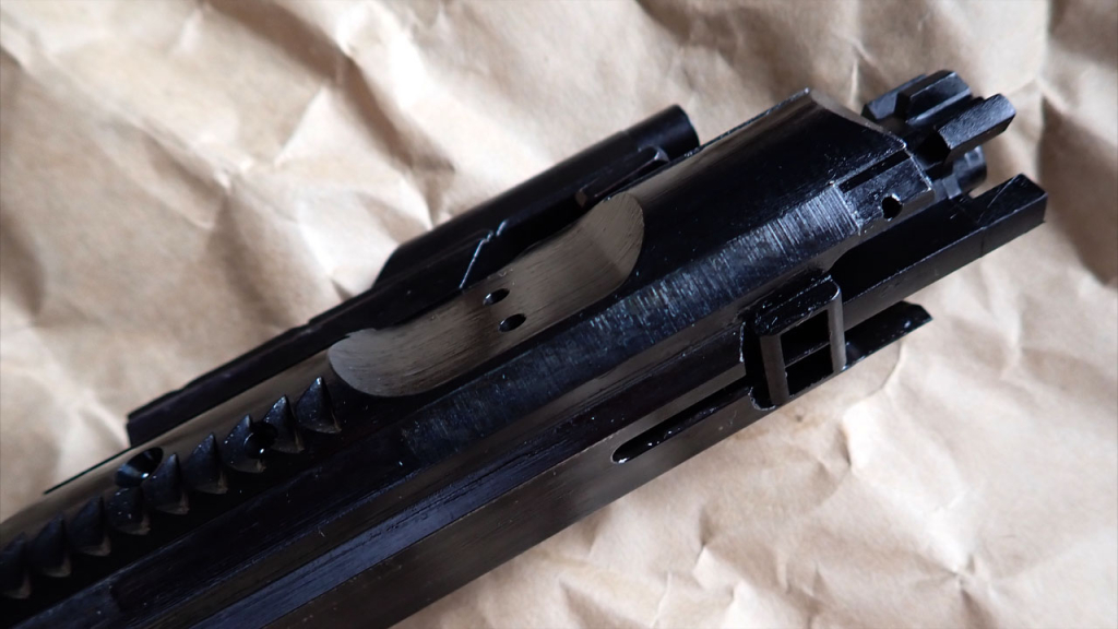 ノーマルでこんなにきれいなボルトは見たことがありません。ブルーイングなのか青みがかった黒で、ツールマーク(製造時の切削痕)と相まって本当に美しい。そしてなんと!側面の穴、モールドじゃなくて穴開いてるんですよ。実銃はDI(ガス直接利用式)なので、銃口近くのガスブロックからガスチューブを通って、発射ガスの一部がボルトキャリア内に入ってきます。このガスの圧力でマイクロロッキングラグに横回転の力を加えてロックを外します。で、そのあとのガスの抜け道としてボルトの横には縦二つに並んだ穴が開いているんですが、今までのM4のGBBはこの穴をモールド(模様)で表現するしかありませんでした。それがこのKS-1はちゃんと穴が開いてるんですよ。ボルトの底側を見てみると、側面の穴とほぼ同じ位置まで溝のように隙間が彫られています。つまりエアガンは強いブローバックのためにボルト内のシリンダ容量をできるだけ大きくするのが定説ですが、このKS-1はシリンダ容量を犠牲にしてリアルに穴開けているんです。では、ブローバックはしょぼいのかというと、先に述べたやわらかいリコイルスプリングのおかげで、十分強いリコイルがあります。ま、CO2化するならシリンダ容量とかは些細な問題ですが。
