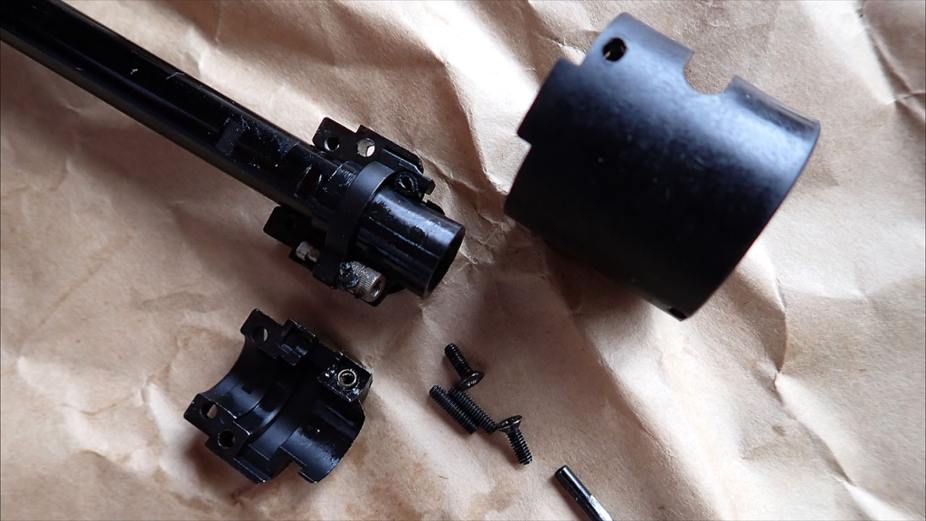チェンバーとインナーバレルはなんと後ろ側に抜けます。電動かよ! これらのレシーバーへの固定は今まで災厄の呪いを封じ込めるような厳重さでバレルナットで固定していました(実銃がそうなんで正しいと言えば正しい)が、KS-1ではアッパーレシーバー下にある小さなイモネジ2本外せば後ろに抜けます。逆にブローバックの衝撃に耐えられるのか不安・・・。チェンバー自体はかなり小ぶりで、ホップ調整はイジェクションポートから6角レンチ突っ込んで、チェンバーパッキンの下あたりにあるネジを回して行います。昔、WAの1911/2011(M4じゃなくて)で採用されていた方式で、WAのM4でもPrimeのカスタムチェンバーも同じだったかと。確かに面倒で調整しにくいですが、今までのガスチューブ回る方式じゃなくなってマジで泣くほどうれしいです。ちなみにリアルになったガスチューブやカッコいいアウターバレル見たかったのですが、ハンドガードの外し方がわからない・・・(たぶん専用工具いるやつ)。