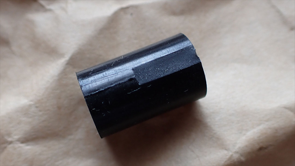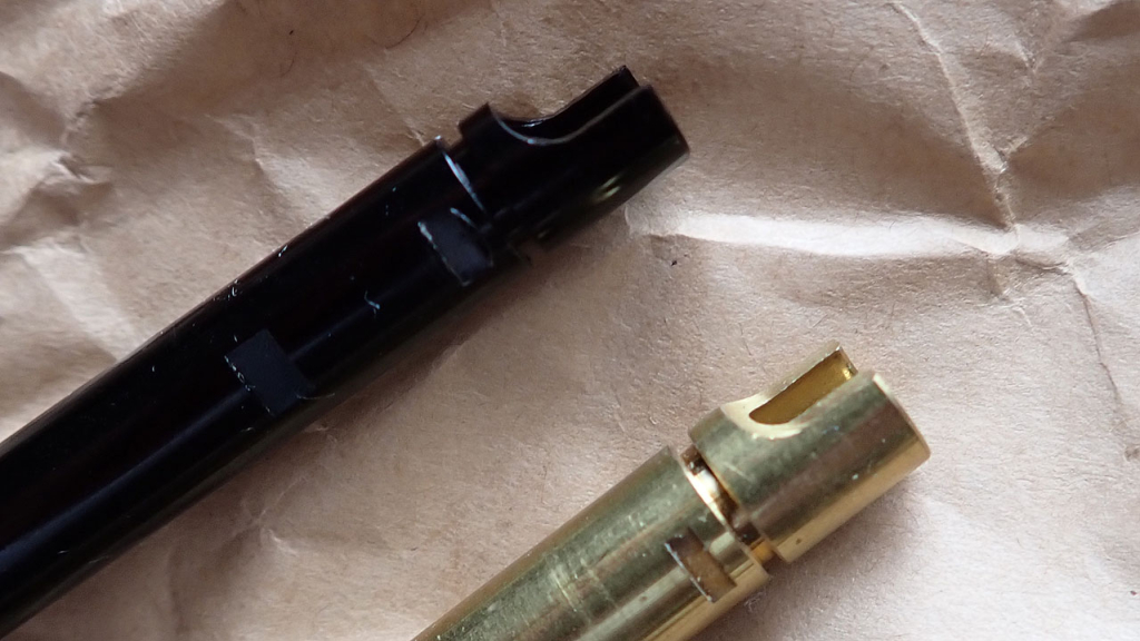 インナーバレルはマルイのGBB互換。上の黒いのがKS-1で下の真鍮のがマルイ純正バレル(たしかグロック)。KS-1のバレルはいつものVFCと同じで黒くアルマイトされたアルミ製。一つ上のチェンバーの写真見てもらえばわかると思いますが、インナーバレルの位置決めの溝は手前(チェンバー)側のほうしか使っていません。チェンバーパッキンは長掛な感じのホップ突起で、これもいつも通り横の位置決め用の突起を切り取ればマルイのGBB用パッキンが使えます。VFCの銃は当たらないで有名なので、MapleLeafあたりからまともなチェンバーユニット出ないかしら。