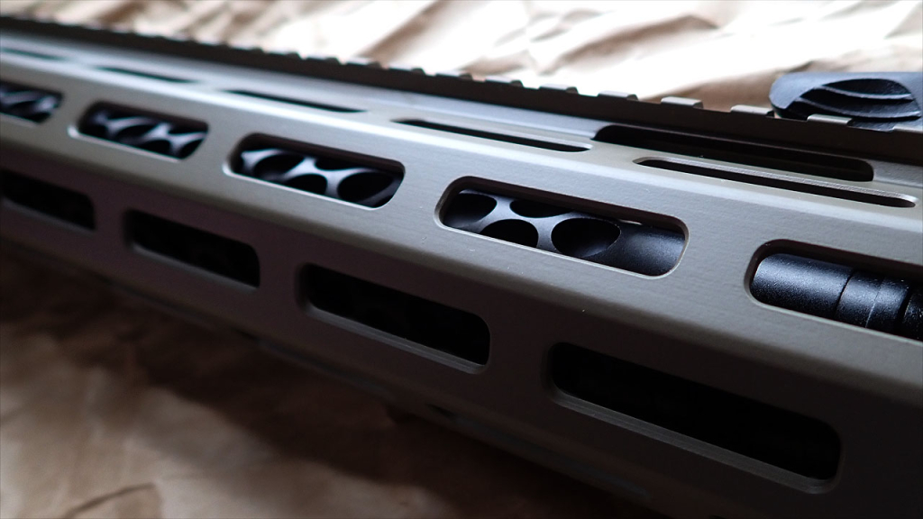 アウターバレルはKS-1ならではのディンプルのヘビーバレル。VFC製品はアルミなので軽いんですけどね。そんでFDEの色具合を比較するためにうちのオールFDEのG&PなM4と並べてみました。このG&PのグリップとストックがMagpulの実パなので、VFCのKS-1は標準的なFDEにかなり近いと言えますね。